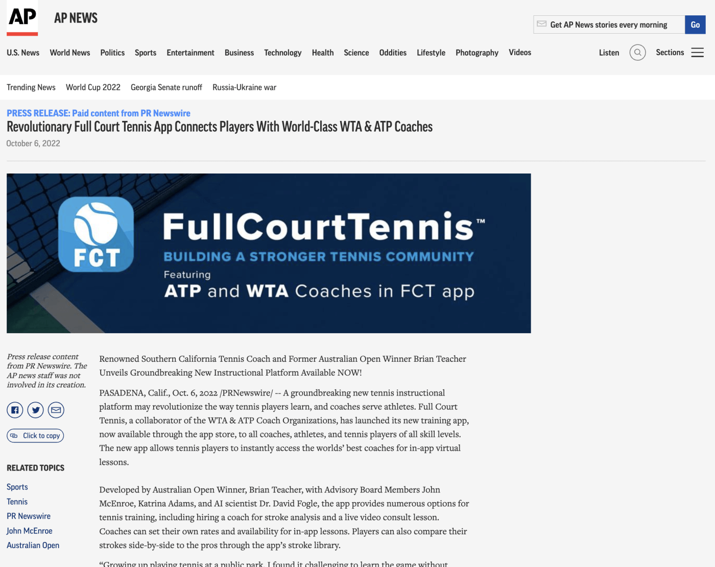 The Full Court Tennis (FCT) app was featured in AP News! To read the full article, click HERE.