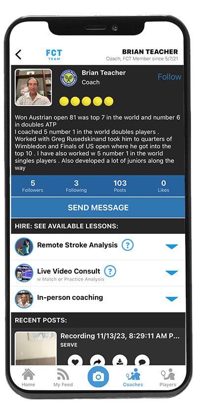 Players search for a Coach and check out their profile. Here is an example of a Coach that can be hired for a Live Video Consult Lesson.
