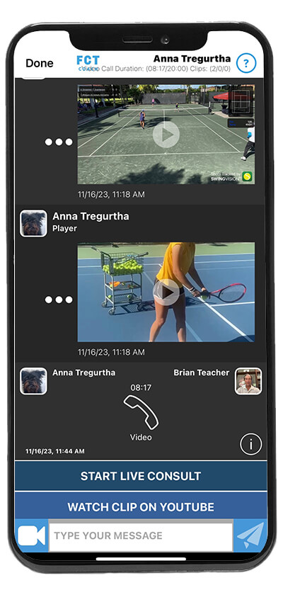 As you can see, the Live Video Consult allows you to chat with your Player. Now Coach and Player have entered the Live Video Consult room. Now the Coach is going to share his screen and go over the video that the Player sent. Coach should tap the white button to broadcast his screen which will enable him to analyze the video the player has sent.