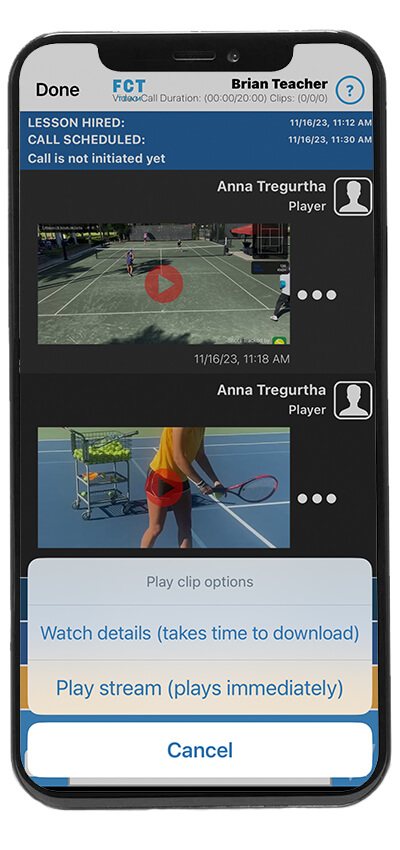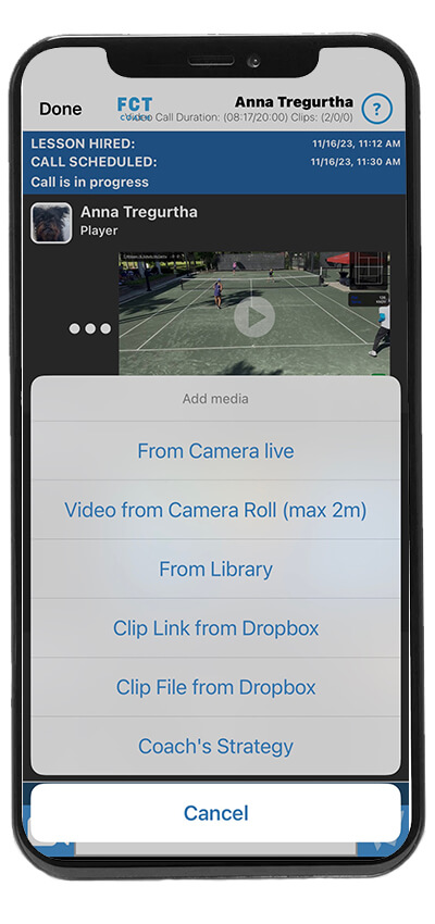 Players can send their coach any length video. Players can also record a full length match on FCT or they can load a prerecorded match onto the FCT app through Dropbox. Dropbox seamlessly connects to the FCT app on your device but you need Dropbox app loaded onto device. In addition, Coach or player can log into the FCT website and seamlessly upload a video into the lesson space.