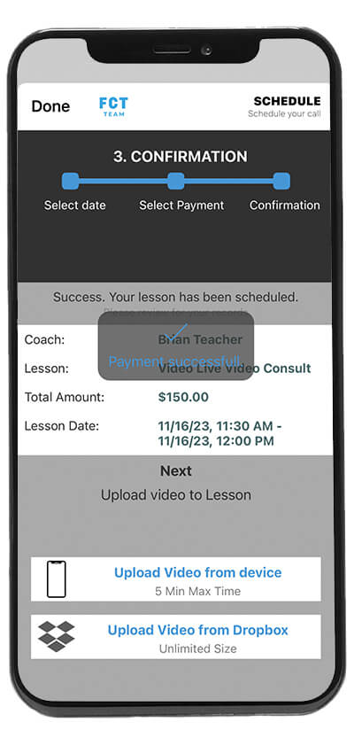 A message shows when the payment is successful and the lesson has been scheduled. Then, press the Upload Video from device.